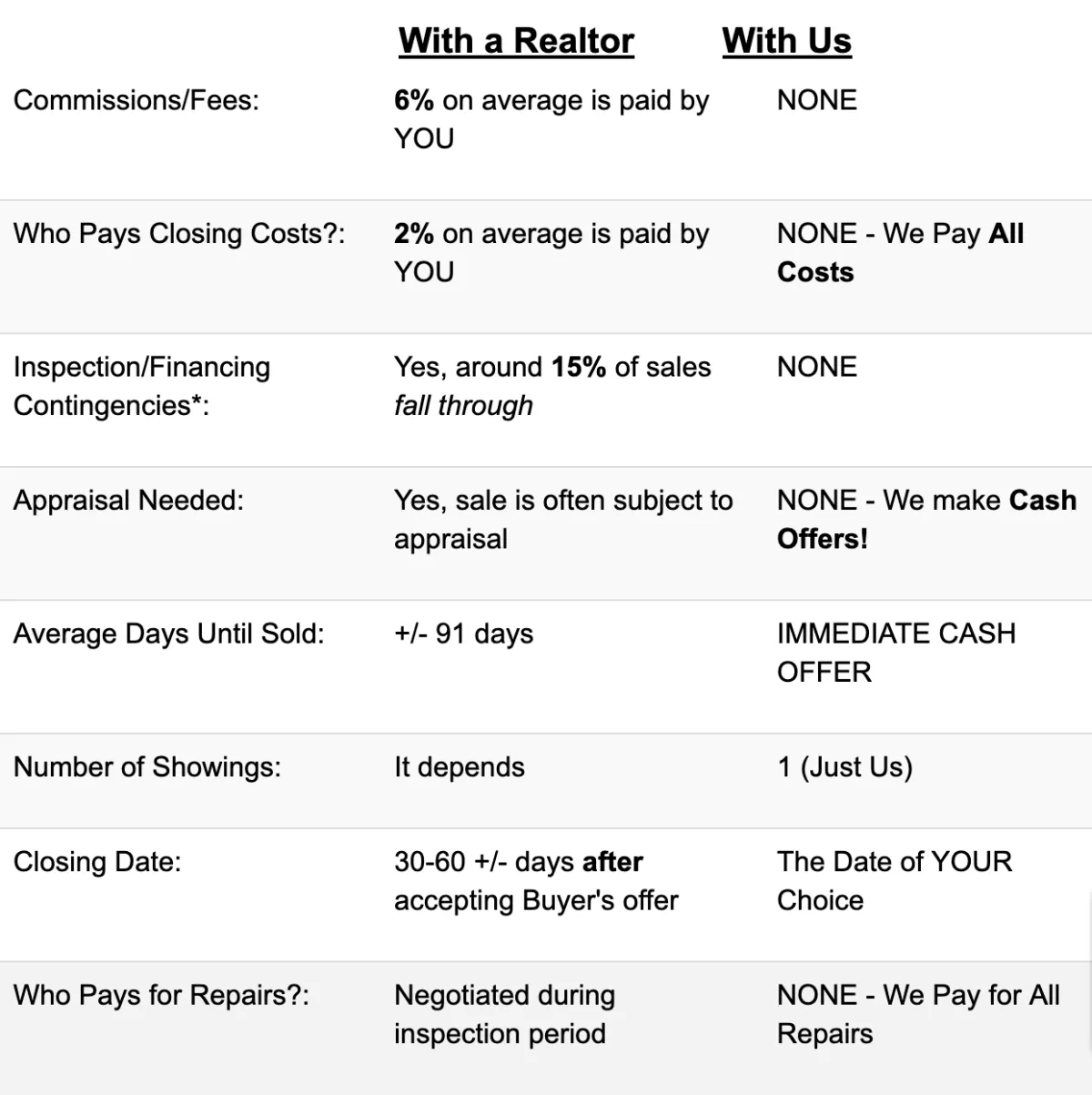 We make multiple offers so you can choose the one thats best for you and after that we'll line up a closing date so you can get paid in days or weeks not months!
